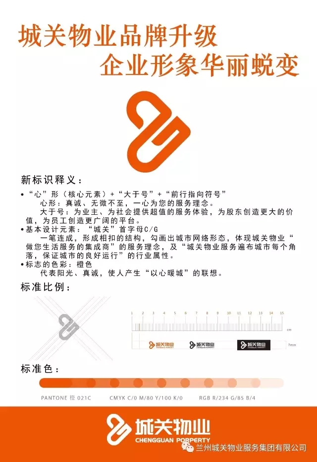 標(biāo)識是企業(yè)品牌使用頻率最高的視覺符號,是形成品牌視覺形象的核心元素,還是品牌形象的象征與精神體現(xiàn)。城關(guān)物業(yè)服務(wù)集團(tuán)新企業(yè)標(biāo)識采用了橙色,代表陽光、真誠,使人產(chǎn)生“以心暖城”的聯(lián)想。并將心形、大于號、前行指向符號作為核心設(shè)計元素集于一體。