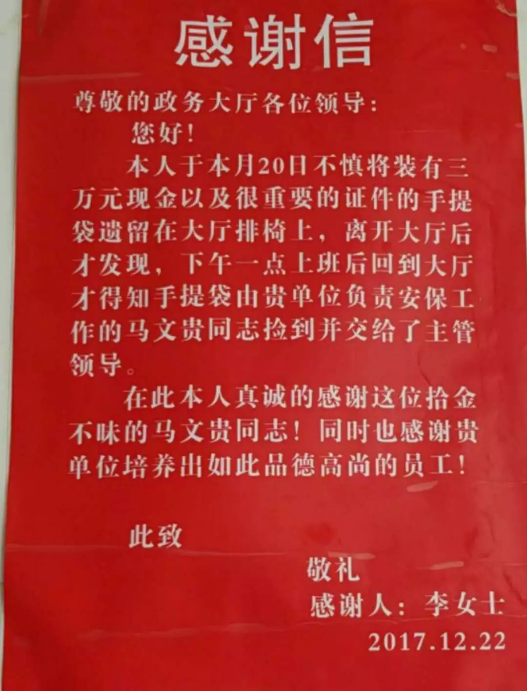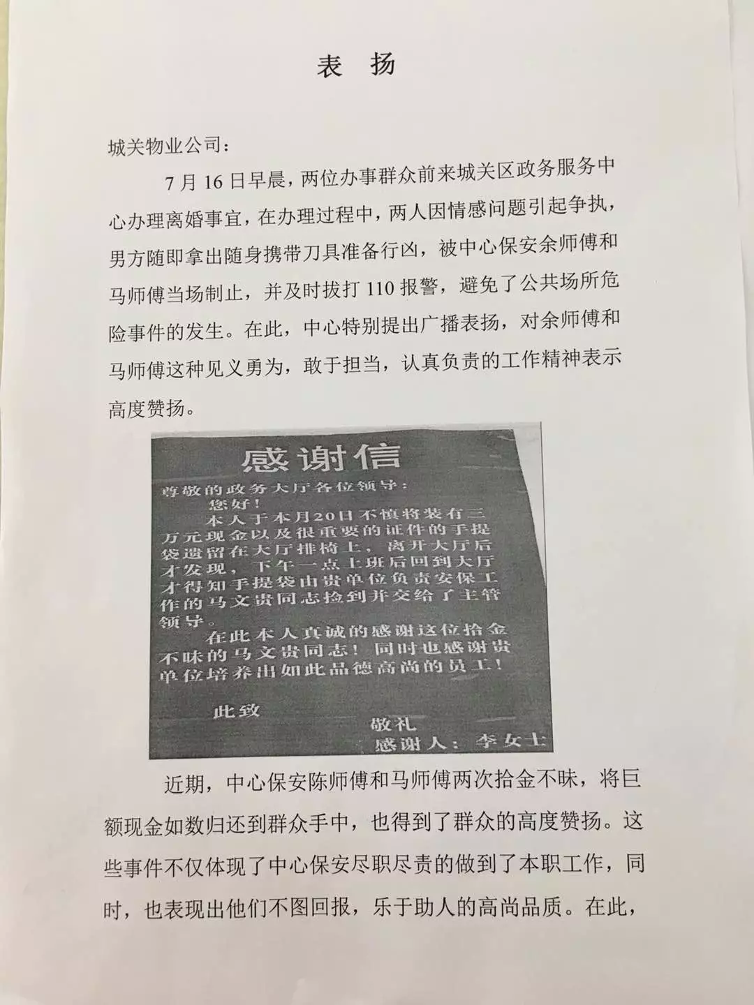 ▲城關(guān)區(qū)政務(wù)服務(wù)中心給城關(guān)物業(yè)馬文貴和余會(huì)明的感謝信