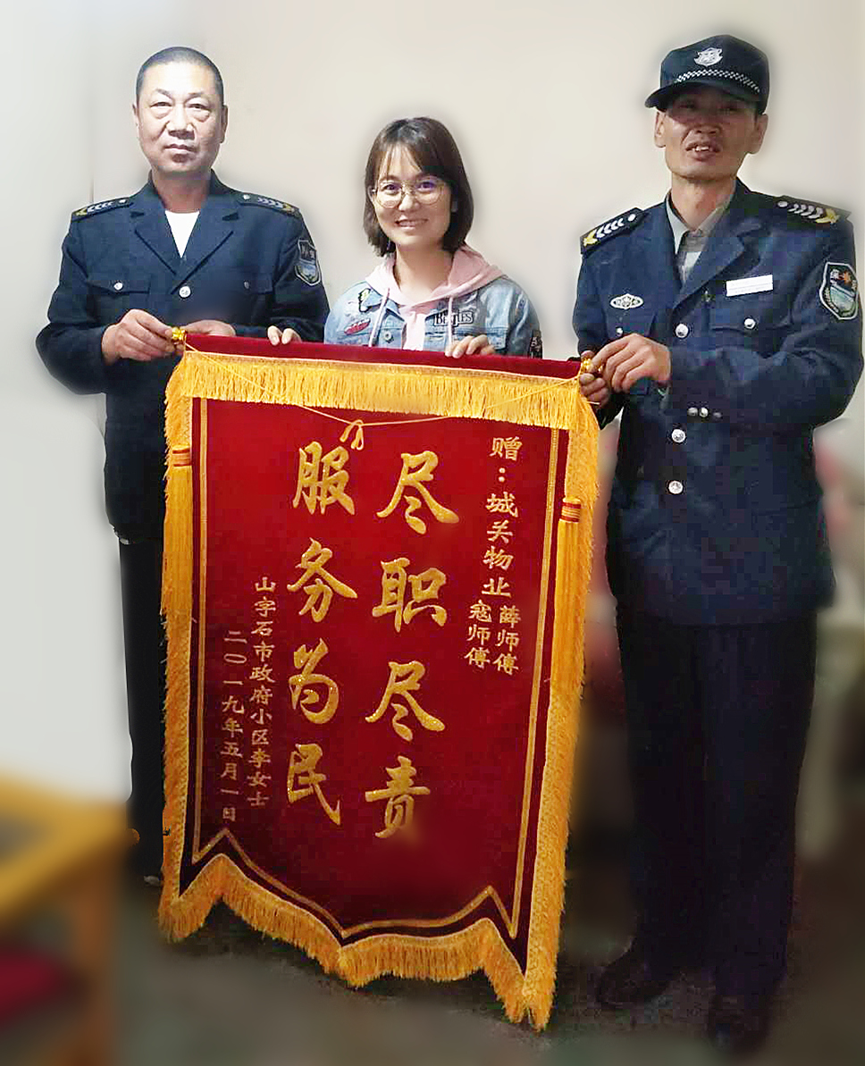 經(jīng)過半個(gè)月的排查,寇懷彥和薛叔杰最終確定領(lǐng)取人是旁邊小區(qū)的住戶,經(jīng)過登門協(xié)調(diào)溝通,快遞于5月1日找回并完璧歸還,交由李女士手中。當(dāng)李女士接過快遞,十分激動(dòng),“本以為我的快遞找不回來了,多虧你們的幫助,太謝謝你們了!”李女士為表感謝,特制作錦旗送至山字石家屬院的門崗處。寇懷彥和薛叔杰接過錦旗,喜笑顏開,他們表示:自己早就把山字石家屬院當(dāng)成自己的家了,照看好家園、守護(hù)好家人是自己的職責(zé),家人的東西丟了,我們幫忙去找,也是理所應(yīng)當(dāng)?shù)氖拢?/span>