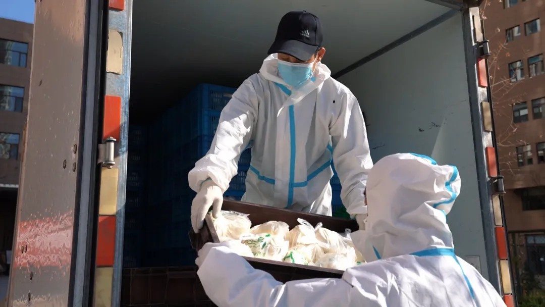 宋師傅是車隊司機之一,他開的是一輛中型貨車,一車能裝兩萬個饅頭,每天從早跑到晚,從東跑到西!疤厥鈺r期,大家都辛苦,也不是我一個人這么拼!”宋師傅黑瘦精干,說話間一車饅頭裝齊又要出發(fā)了。11月10日下午3點左右,宋師傅運送饅頭的車停在安瀾祥園物業(yè)門口,“全副武裝”的物業(yè)工作人員早早等候在那里。大家搬運、分裝、分頭上門派送。每戶10個饅頭,先按5個用塑料袋分裝,再用專門訂制的綠色環(huán)保手提袋裝起來送到業(yè)主手中。